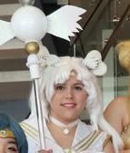 Sailor Cosmos cosplay worn at AX 2018 with Sailor Moon group. Bangs were curled using a straightener (check heat setting) and foam curlers. Leave them in until the bangs have curled but the longer the better. Leotard was purchased from Discount Dance. Collar and skirt are made from white bridal satin from JoAnn. Chest piece (star with wings) made from craft foam, worbla, and small plastic ornament. Prop is large Christmas ornament from Michaels.com with clean PVC pipe. other pieces are PVC pipe and wood sanded. (You can find the full photos on my instagram)