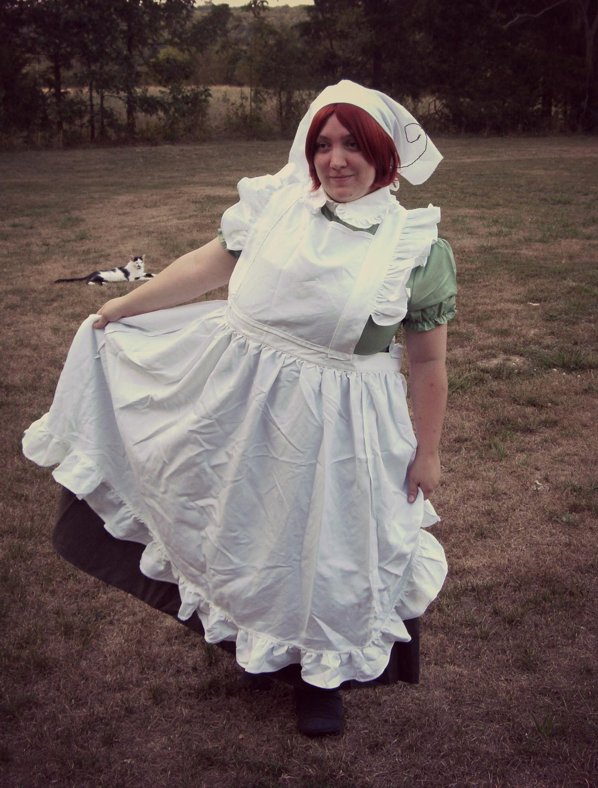 Honestly? This cosplay was bought, but the difficult part was being able to fit it to my size. I’m a plus-size cosplayer, and this cosplay was definitely NOT the first choice for plus-size girls. The dress is a little snug in spots, but the apron was the worst. The way to attach it around your waist was originally velcro, but with how big I am/how short the material was, I couldn’t fasten it. I asked a friend of mine to alter it to where it’s able to be tied back, so that helped a lot!