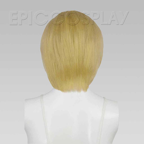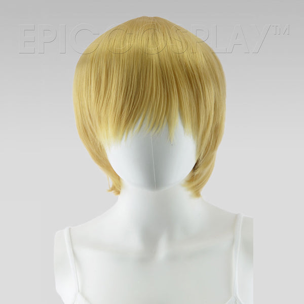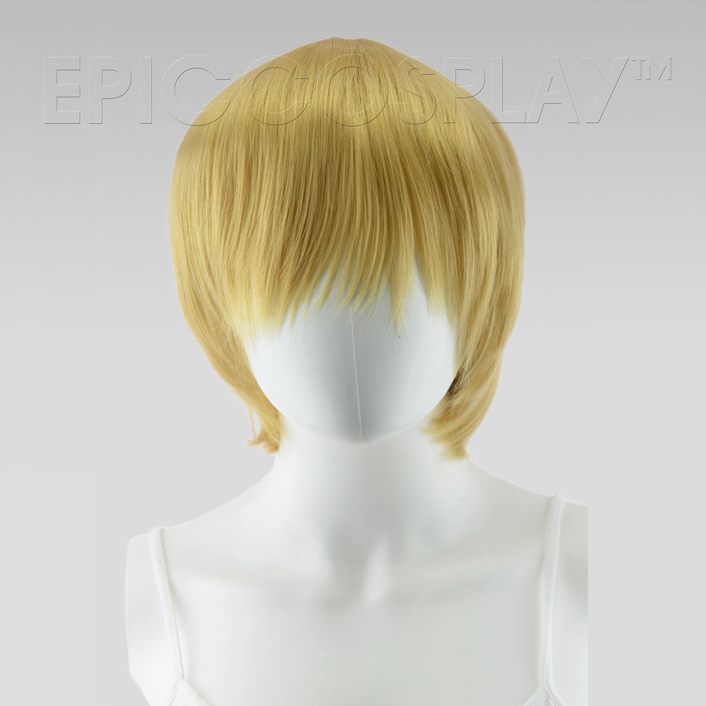 Aether Caramel Blonde Layered Short Wig Our Aether style Caramel Blonde layered short wig offers a versatile and easy to wear way of achieving a short and easy to manage hairstyle. This wig is perfect for both cosplay and daily wear without the commitment of cutting your own locks. Our adjustable, breathable 23" cap makes this Caramel Blonde layered short wig capable of fitting both male and female head sizes comfortably. The Aether style is also available in a variety of different colors, available to view here. A circular skintop at the crown of this Caramel Blonde layered short wig makes it easy to part and style in numberous ways. Bangs reaching 3.5" can be changed to face a variety of different directions, making almost any look possible. Altogether, this wig measures 12" in length and has short layers blended in for added texture. It comes with a naturally sleek look, but the short layers make it easy to spike this wig with the help of a little bit of product. Our heat resistant fiber, capable of withstanding heat up to 410 degrees Fahrenheit (though we suggest not exceeding 350F, as long-term exposure can change the texture of the fiber) make it possible to take styling tools such as flat irons and blow dryers to this wig.