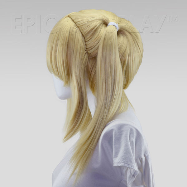 Long and flowing pigtails are a classic staple in the cosplay world. Our Gaia style Natural Blonde pigtail wig offers an easy and natural looking way to achieve such a classic and timeless look. Front facing bangs reach a a total of 7", making them versatile in creating a number of different styles. Longer side bangs that fall to 10 1/2" create a flattering, face framing appearance with ease. Long twin tails allow for styling as is, or can be customized with our many clip on extensions and accessories, such as our 50" waterfall extensions and clip-on buns. To top it all off, the back of this wig is naturally pulled back into the pigtails with a long skintop to create a natural part that can be readjusted as you see fit.