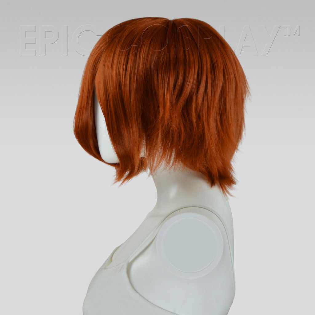 Aphrodite Copper Red Long Bang Layered Short Wig The Aphrodite style is an asymmetrical short wig with a layered back and slightly longer bangs designed to frame and flatter the sides of the face. With its heavily layered back, this wig can be styled as smooth or as spiked as you'd like. Shaggy styles are as simple as running your fingers through the layers and adding just a touch of hairspray. This Copper Red long bang layered short wig features a coin-shaped skintop at its crown, making it easy to part in any direction while keeping a natural look. Heat resistant fiber makes it possible to style this wig with tools such as flat irons, curling irons, or blow dryers. This Copper Red long bang layered short wig is capable of withstanding temperatures up to 410 degrees Fahrenheit (though we suggest keeping heat around 350F to avoid changing the texture of the fiber) making a wide variety of styles possible. Our fiber is also tangle resistant, making maintenance an easy and hassle free job. The Aphrodite Copper Red long bang layered short wig features an adjustable, breathable 23" cap that fits both male and female head sizes comfortably for all day wear.