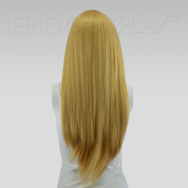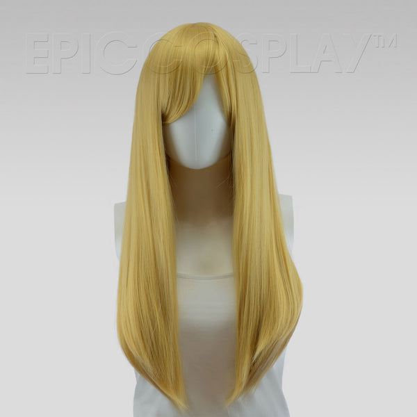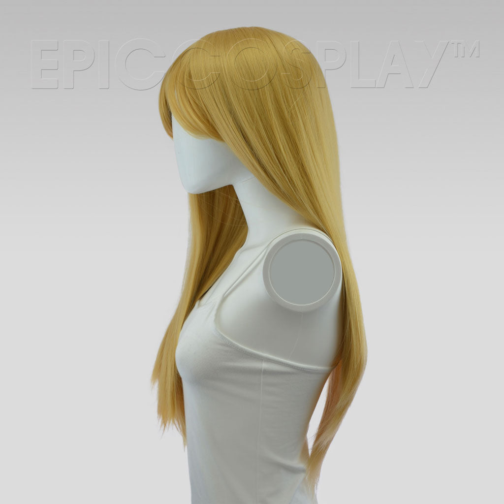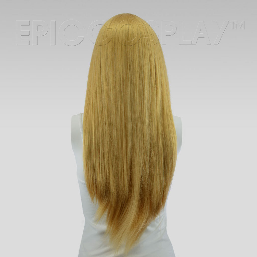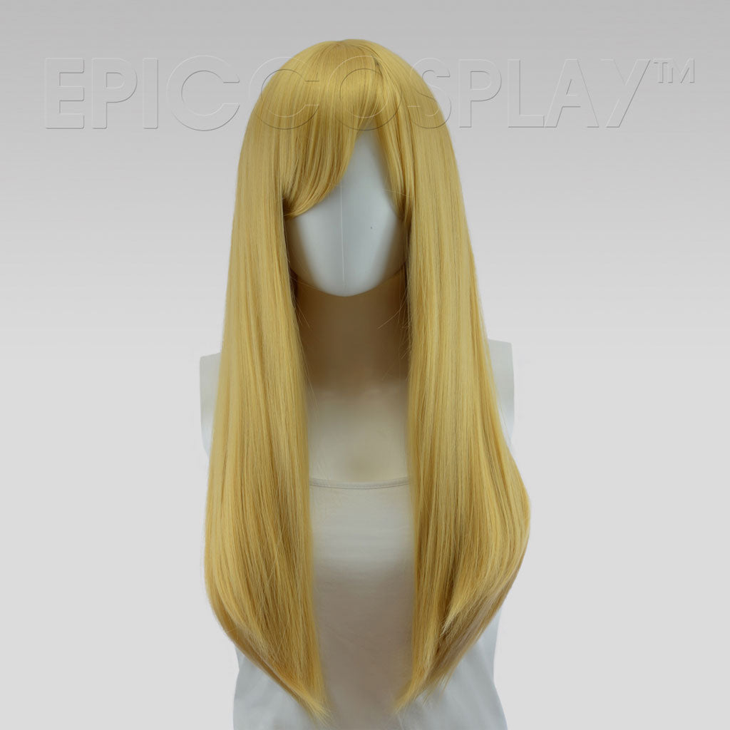 Nyx Caramel Blonde Long Straight Wig This wig is a Caramel Blonde long straight wig perfect for cosplay, costuming, and even casual daily wear. As one of our most versatile styles, you're free to cut it, curl it or style it in any way that suits your needs. This Caramel Blonde long straight wig reaches a total length of 28 inches and comes with 6 inch bangs that can be simply swept to the side, trimmed, or styled in any way otherwise. A unique skintop at the hairline of this wig offers a natural and realistic looking part that can be changed with heat or left as is. Our wigs are made of tangle resistant fibers that make maintenance and care an easy, hassle free job. The fibers in this Caramel Blonde long straight wig are also heat resistant and capable of withstanding temperatures up to 410 degrees Fahrenheit (though we suggest keeping the temperature around 350F, as long term exposure to heat can potentially change the texture of the fiber). This means you can safely use heated tools such as flat irons, curling irons, and blow dryers to style this wig however you'd like. An adjustable, breathable wig cap makes this Caramel Blonde long straight wig comfortable to wear by anyone regardless of head shape and size for all day use.