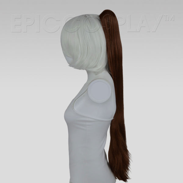 This Medium Brown long ponytail clip measures at 35", making it perfect for long ponytails or even long pigtails if you use two clips. You can mix-and-match this clip with any of our wigs, and attach it wherever there are wefts and netting. A large alligator claw clip at the top of the ponytail makes application as simple as squeezing the clip and hooking it onto the wig. This Medium Brown long ponytail clip is also available in a variety of colors to match any color wig you'd like to use as a base.
