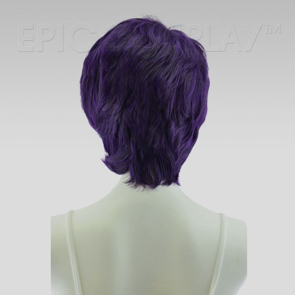 Hermes Purple Black Fusion Pixie Hair Wig The 12" short Purple Black Fusion pixie hair has naturally feathered layers all throughout, giving it a textured look and making it perfect for voluminous and spiked styles. This style extends down at the nape of the neck to hide any existing hairline. Short bangs in the front are easy to style upwards or flat against the forehead with the help of a flat iron or blow dryer, allowing this Purple Black Fusion pixie hair to be versatile and used for a variety of different looks. Our adjustable, breathable 23" cap makes this Purple Black Fusion pixie hair capable of fitting both male and female head sizes comfortably. The fiber in this Purple Black Fusion pixie hair is heat resistant, meaning it's possible to style with tools such as flat irons and blow dryers up to temperatures of 410 degrees (though we recommend keeping tools around 350F, as the fiber's texture can change with long-term exposure to heat). With heat and product, it's possible to style anything from dramatic spikes to a sleek, smoothed down look. Our tangle-resistant fibers also make care and maintenance a breeze.