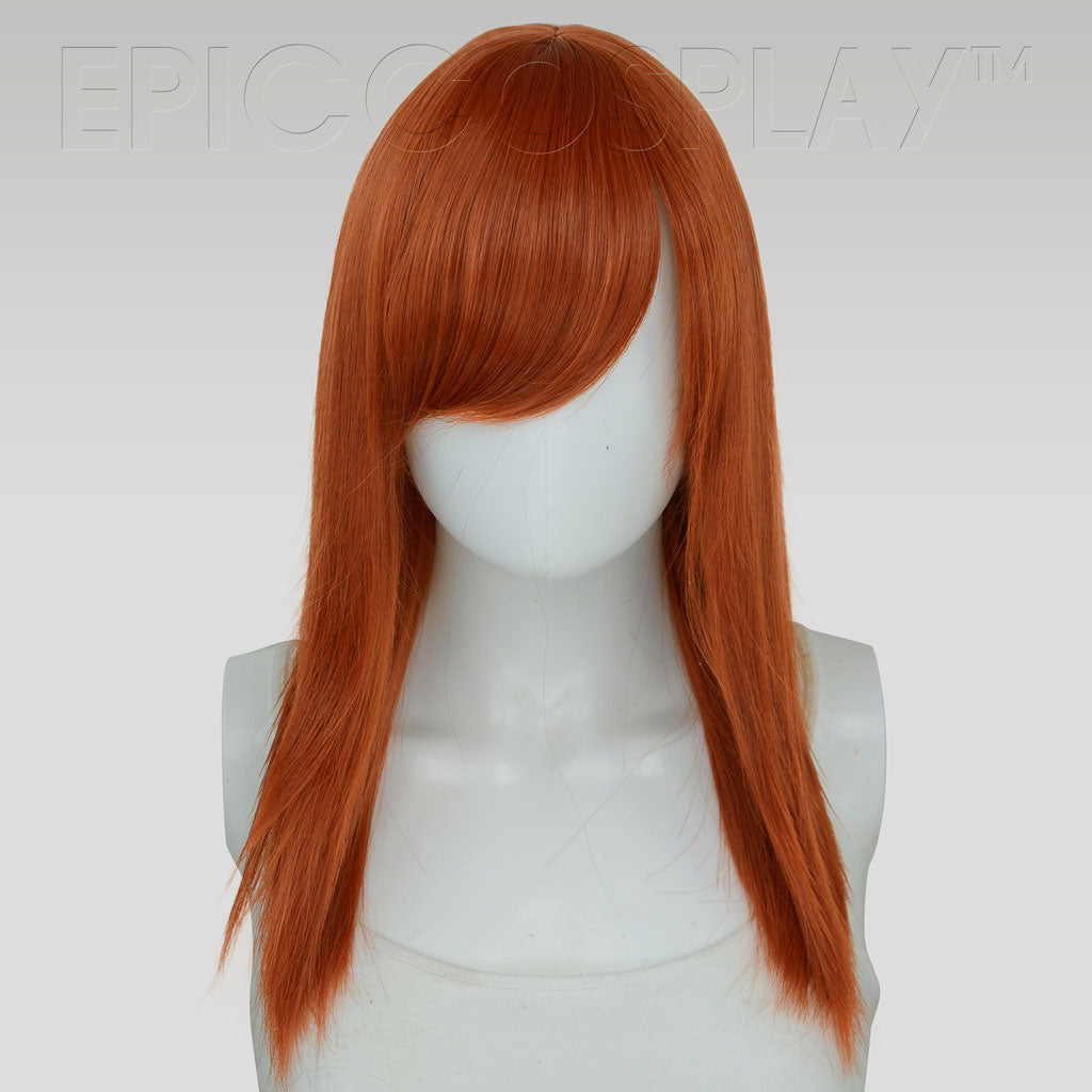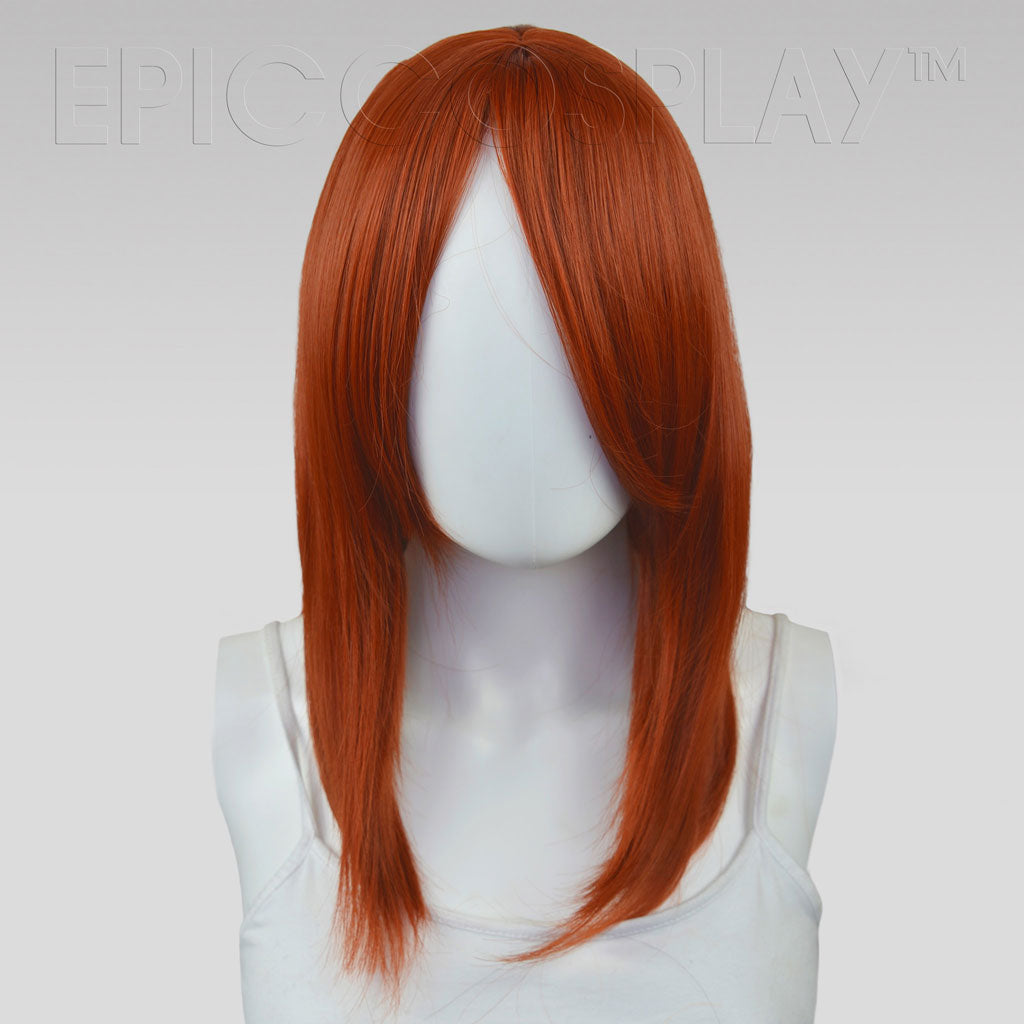Theia Copper Red Medium Wig Our Theia is a straight and very versatile style perfect for cosplay, costuming, or even casual daily wear. This Copper Red medium wig reaches an overall length of 20", making it fall slightly past the shoulders on most wearers