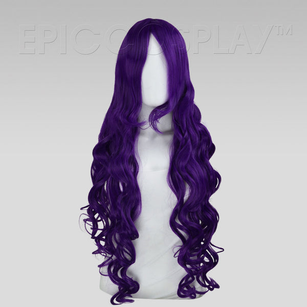 Hera Long Curly Royal Purple WigOur Hera style is one of our most iconic styles known for its soft, luscious curls and incredible length. This long curly Royal Purple wig measures at a total of 40 inches with long bangs that fall to approximately 11 inche