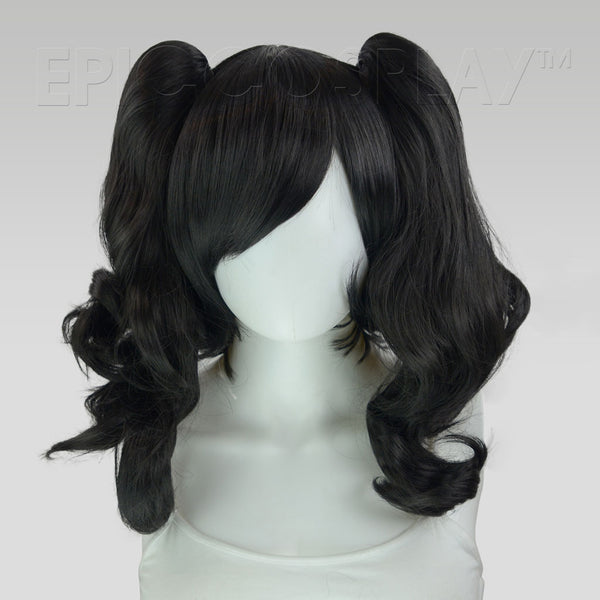 Rhea Black Pigtail Wig SetThis Black pigtail wig set uses our 14" Chronos style as a base for two of our 20" clip-on ponytails to create a a fun and versatile pigtail style. The base wig is a short bob cut style that frames the face and can be worn indepe