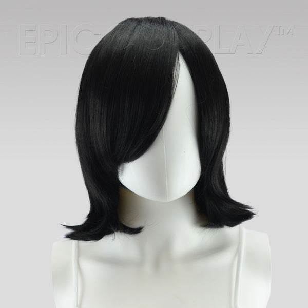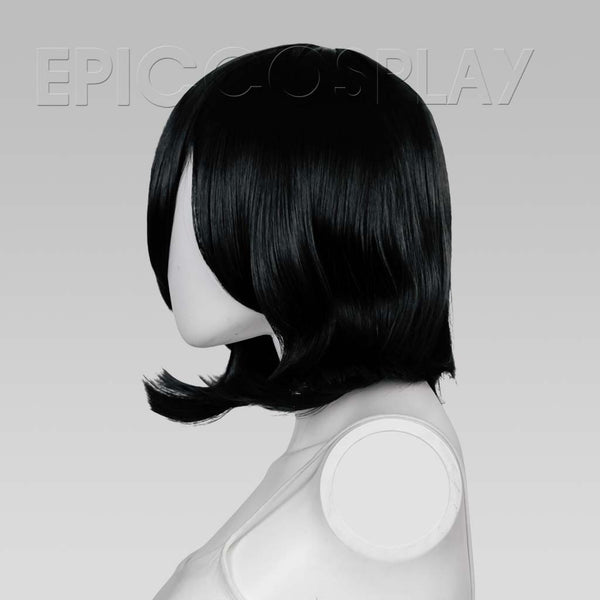 Aura Black Long Bob Wig Our Aura style is a Black long bob cut that reaches a total of 16", making it slightly longer than our Chronos style. This Black long bob cut comes down to rest on the shoulders, naturally curling in very slightly to create a cute and flattering face framing shape. Long bangs that reach 7" offer a wide variety of options for styling, and can be trimmed easily with shears or a razor comb. A 2" coin shaped skin top at the side of the crown of this wig gives it a natural looking part that can be changed easily. Due to our heat resistant fibers, this Black long bob can be styled with the help of heated tools such as flat irons, curling irons, and blow dryers up to 410 degrees Fahrenheit (though we suggest that heat stay around 350F, as long-term exposure to heat can change the texture of the fiber). Our fiber is also tangle resistant, making styling and care an easy job. An adjustable, breathable wig cap makes it so that this Black long bob can be worn comfortably by a variety of head shapes and sizes for all day wear.