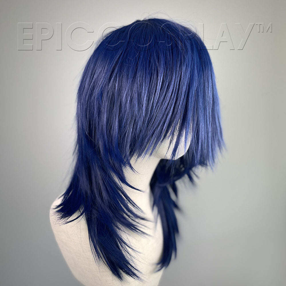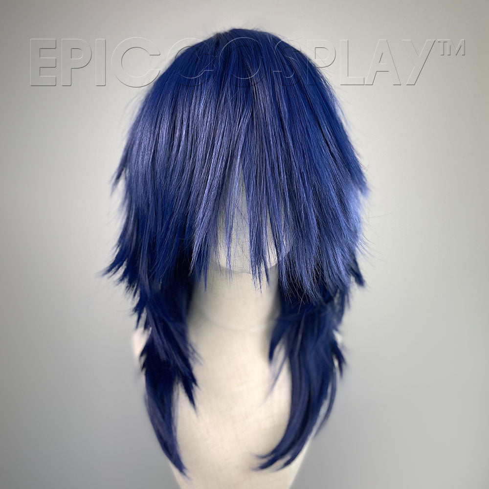 Modified Helios Middle Night Blue Medium Wig This is our modified version of our Helios design. Our old version had a quarter-sized skin top in the middle and non crimped roots. We’ve removed the skin top completely and crimped the roots, making spiking even easier than before! This wig measures at 11" from the back of the hairline to the longest part of the wig, and features a variety of different lengths that make it perfect for shaggy and spiked appearances. The front and sides of this wig are significantly shorter than the back. Our heat resistant fibers make it possible to style this Middle Night Blue Medium wig for spiking with heated tools such as flat irons, curling irons, and blow dryers. Tools reaching temperatures up to 410 degrees Fahrenheit can be used, though we suggest keeping the temperature around 350F as long-term exposure to heat can potentially change the texture of the wig fiber. Our fiber is also tangle resistant, making styling and care an easy job. An adjustable, breathable cap makes this Middle Night Blue Medium wig for spiking comfortable to wear by anyone regardless of head shape and size, male or female. Modified Helios Middle Night Blue Medium Wig Dimensions Cap Size: 21" Length: 11" (from back of hairline to longest part of wig) Bang Length: 7" (from hairline to long part of bang)