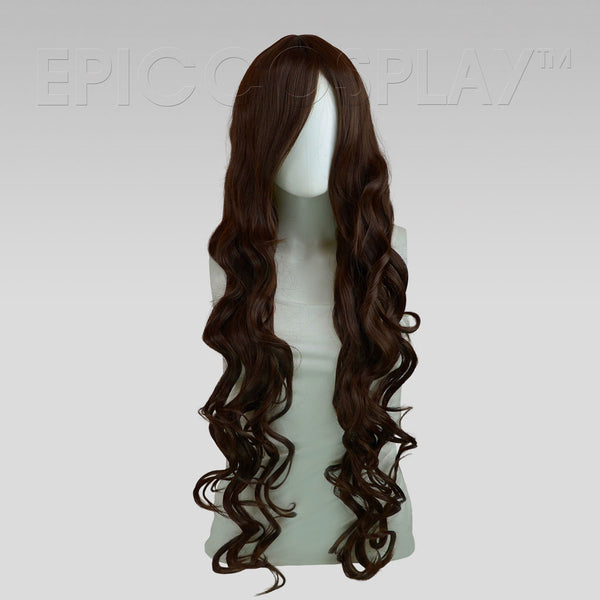 Hera Long Curly Dark Brown Wig Our Hera style is one of our most iconic styles known for its soft, luscious curls and incredible length. This long curly Dark Brown wig measures at a total of 40 inches with long bangs that fall to approximately 11 inches. Due to the length of these bangs, versatility is practically endless when it comes to styling; You can pin them to the side, part them in the middle for a face framing look, or give them a little trim to create your own perfect Hime cut bangs. This long curly Dark Brown wig is available in a wide variety of beautiful and unique colors, which can all be viewed here. This long curly Dark Brown wig, along with the rest of our wigs, is created using a high-quality synthetic fiber that is both tangle resistant and heat treatable. Due to this quality, this wig can be styled with heated tools such as flat irons, blow dryers, and curling irons reaching temperatures up to 410 degrees Fahrenheit (though we do suggest keeping heat around 350 degrees to avoid potentially changing the fiber's texture). The soft and silky texture of this long curly Dark Brown wig helps to keep it tangle free and easy to mantain, even after multiple uses. An adjustable, breathable cap allows for comfortable wear all day long, regardless of head shape or size.