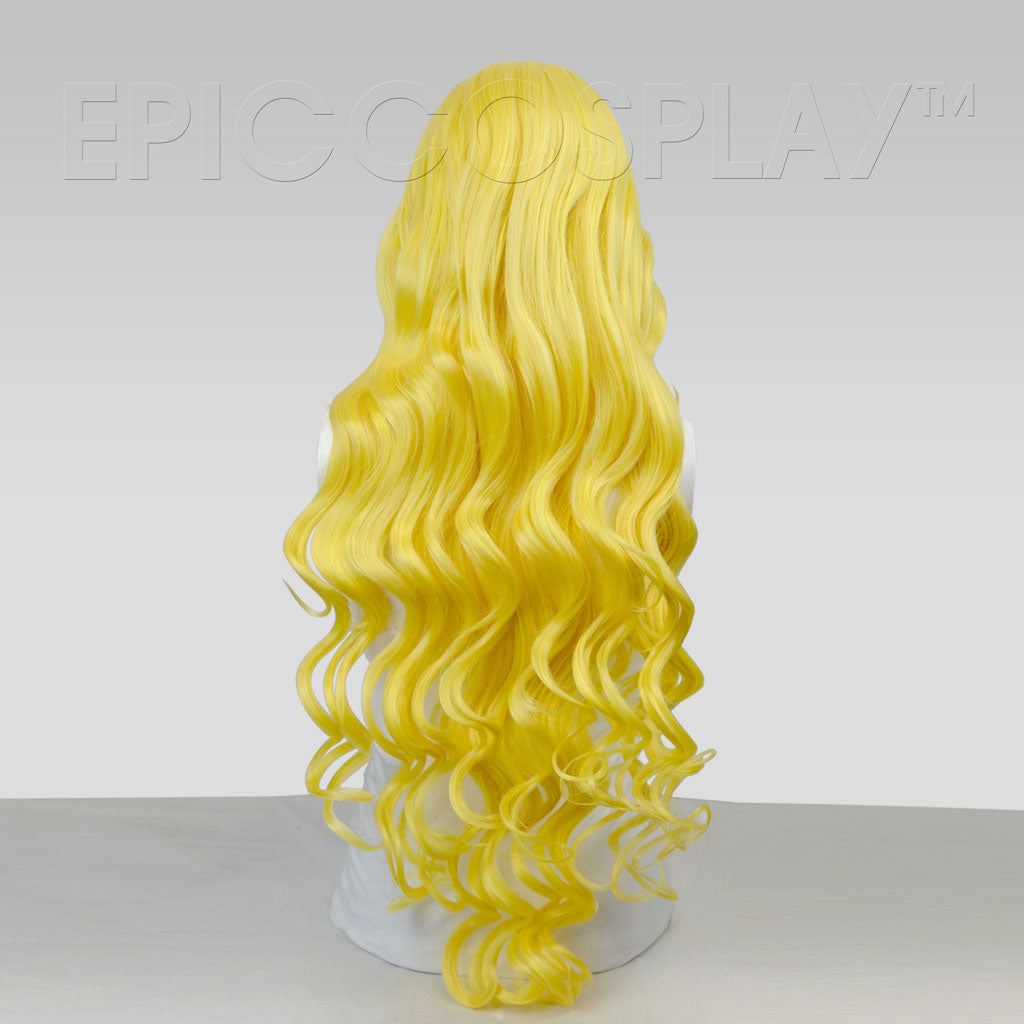 Hera Long Curly Rich Butterscotch Blonde Wig Our Hera style is one of our most iconic styles known for its soft, luscious curls and incredible length. This long curly Rich Butterscotch Blonde wig measures at a total of 40 inches with long bangs that fall to approximately 11 inches. Due to the length of these bangs, versatility is practically endless when it comes to styling; You can pin them to the side, part them in the middle for a face framing look, or give them a little trim to create your own perfect Hime cut bangs. This long curly Rich Butterscotch Blonde wig is available in a wide variety of beautiful and unique colors, which can all be viewed here. This long curly Rich Butterscotch Blonde wig, along with the rest of our wigs, is created using a high-quality synthetic fiber that is both tangle resistant and heat treatable. Due to this quality, this wig can be styled with heated tools such as flat irons, blow dryers, and curling irons reaching temperatures up to 410 degrees Fahrenheit (though we do suggest keeping heat around 350 degrees to avoid potentially changing the fiber's texture). The soft and silky texture of this long curly Rich Butterscotch Blonde wig helps to keep it tangle free and easy to mantain, even after multiple uses. An adjustable, breathable cap allows for comfortable wear all day long, regardless of head shape or size.