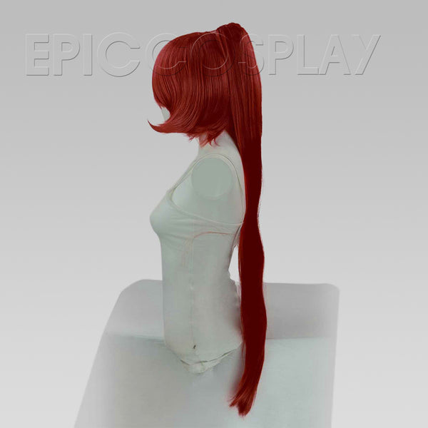 You've heard of letting your hair down, but what about wearing it up for change? Our Dark Red long straight ponytail wig set is a beautifully sleek and fashionable way to complete any cosplay costume or simply make a bold statement. Our 14" face framing Chronos wig serves as a bob cut style base for this particular set and can be worn entirely on its own or with the clip-on ponytail. Versatile 5" bangs offer a wide variety of styling options such as middle parts, sideswept bangs, and blunt cuts. The clip-on ponytail included in this set measures to approximately 35", making it fall past the lower back on most wearers. This clip can be strongly secured almost anywhere on the base wig, whether it be the back, sides, high or low. Many different styles can be easily achieved with the help of this Dark Red long straight ponytail wig set.