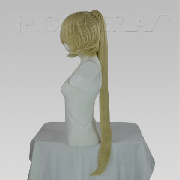 You've heard of letting your hair down, but what about wearing it up for change? Our Natural Blonde long straight ponytail wig set is a beautifully sleek and fashionable way to complete any cosplay costume or simply make a bold statement. Our 14" face framing Chronos wig serves as a bob cut style base for this particular set and can be worn entirely on its own or with the clip-on ponytail. Versatile 5" bangs offer a wide variety of styling options such as middle parts, sideswept bangs, and blunt cuts. The clip-on ponytail included in this set measures to approximately 35", making it fall past the lower back on most wearers. This clip can be strongly secured almost anywhere on the base wig, whether it be the back, sides, high or low. Many different styles can be easily achieved with the help of this Natural Blonde long straight ponytail wig set.