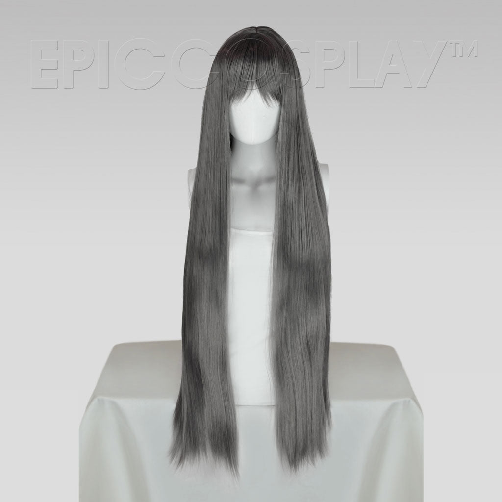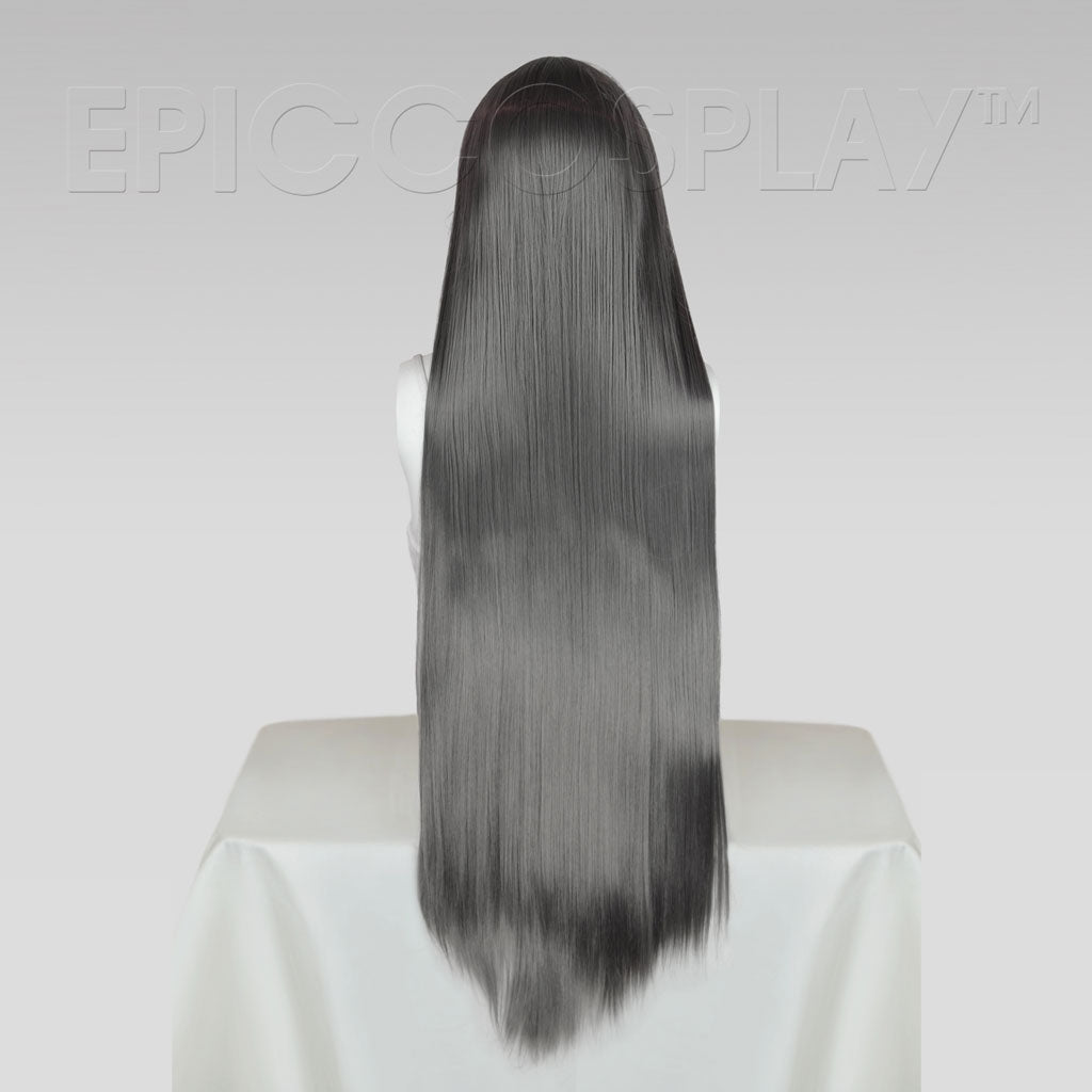 Our Persephone style Gunmetal Grey Long straight wig boasts an impressive total of 40” in length. This style is long enough to reach the mid-back on someone who is 5’5’’, so be sure to take into consideration your own height to estimate where it will fall. This wig comes with 5” bangs perfect for wearing straight out of the bag. These bangs can be worn straight, side swept, or even cut and styled to suit your specific needs. A skintop at the crown of this wig makes it possible to part the hair in a variety of ways with the help of a little bit of heat. This Gunmetal Grey long straight wig is also tangle resistant, which makes maintenance and care an easy, hassle free job.