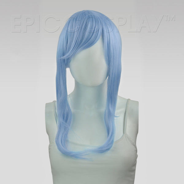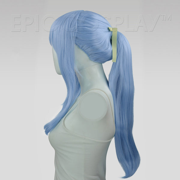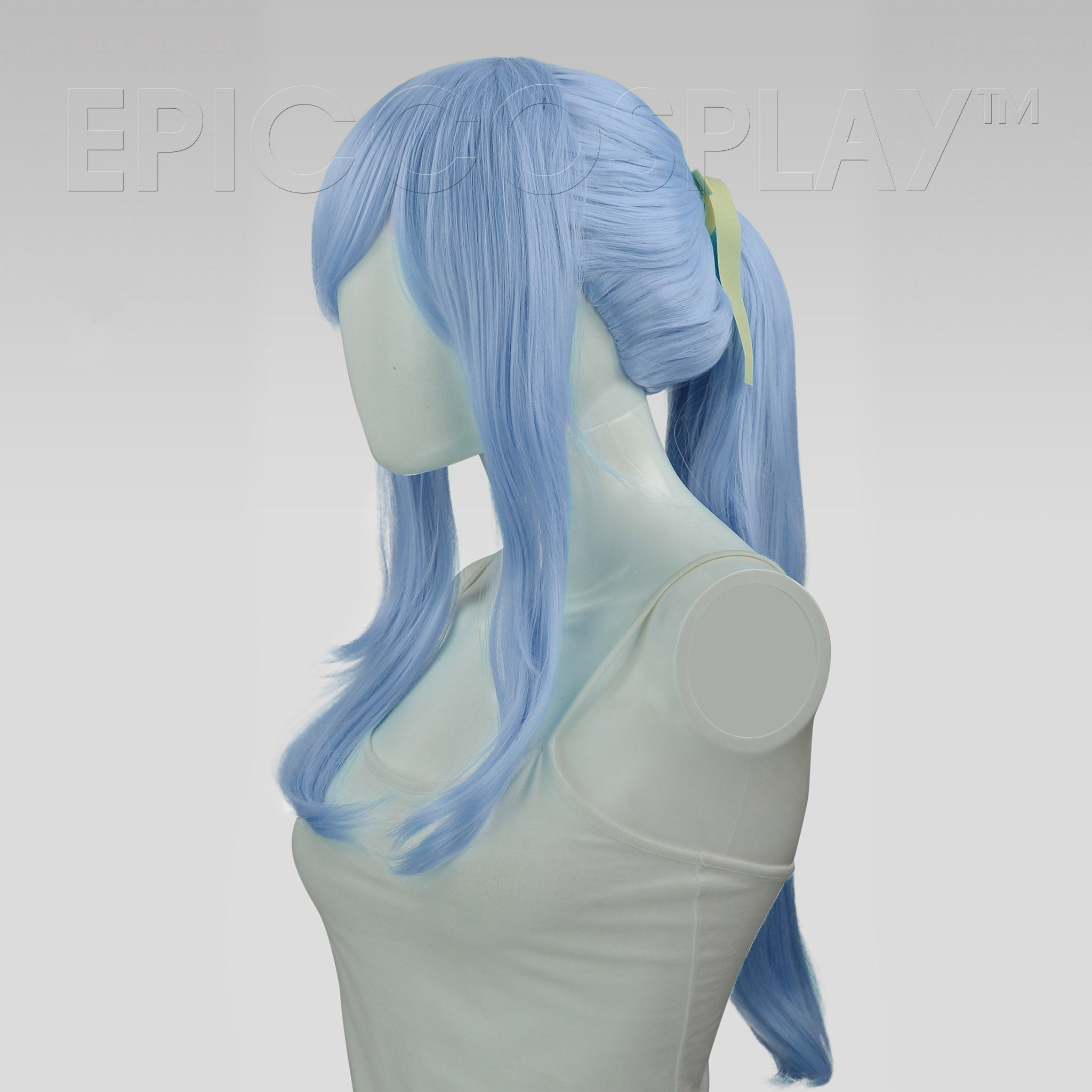 Phoebe Ice Blue Ponytail Wig This Ice Blue ponytail wig is naturally pulled back to create a beautiful and realistic look. Starting at its base, the wig is pulled into a short ponytail reaching 7". This ponytail can be undone to be raised, lowered, or adjusted in any way you desire.
