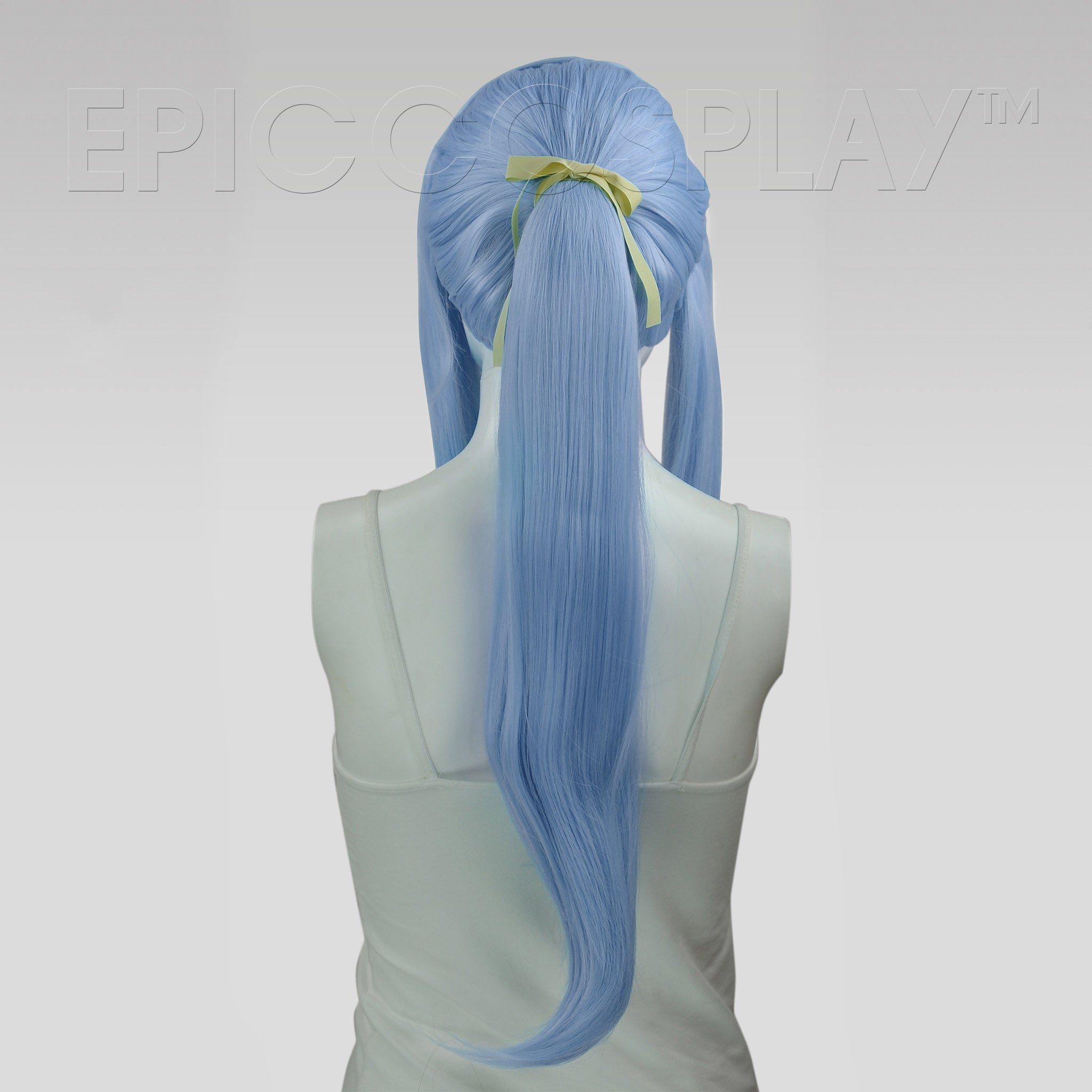 Phoebe Ice Blue Ponytail Wig This Ice Blue ponytail wig is naturally pulled back to create a beautiful and realistic look. Starting at its base, the wig is pulled into a short ponytail reaching (base length if applicable). This ponytail can be undone to be raised, lowered, or adjusted in any way you desire. This wig also comes with a 22" ponytail extension that can be easily attached by hooking the clip into the base ponytail and securing it by tying the ribbons, as shown below. Additional volume and length can be added to this Ice Blue ponytail wig using our clip on ponytails and extensions. Bangs reaching 7" and a side fringe reaching 15" make this Ice Blue ponytail wig easy to customize and style however you'd like, while also maintaining a natural look to disguise the natural hairline. Our heat resistant fiber makes it possible to style this wig with tools such as flat irons, curling irons, and blow dryers up to 410 degrees Fahrenheit (though we suggest keeping them around 350F, as long-term exposure to high temperatures can change the texture of the wig fiber). An adjustable 21" cap makes this Ice Blue ponytail wig fit snug around most heads to avoid slipping, while remaining breathable for comfortable wear.