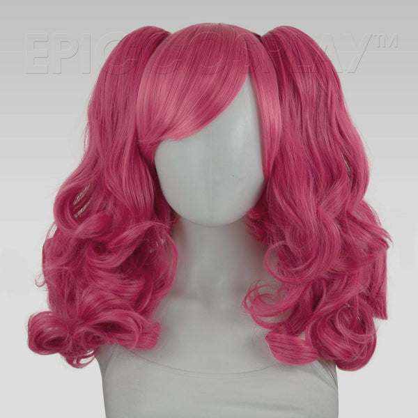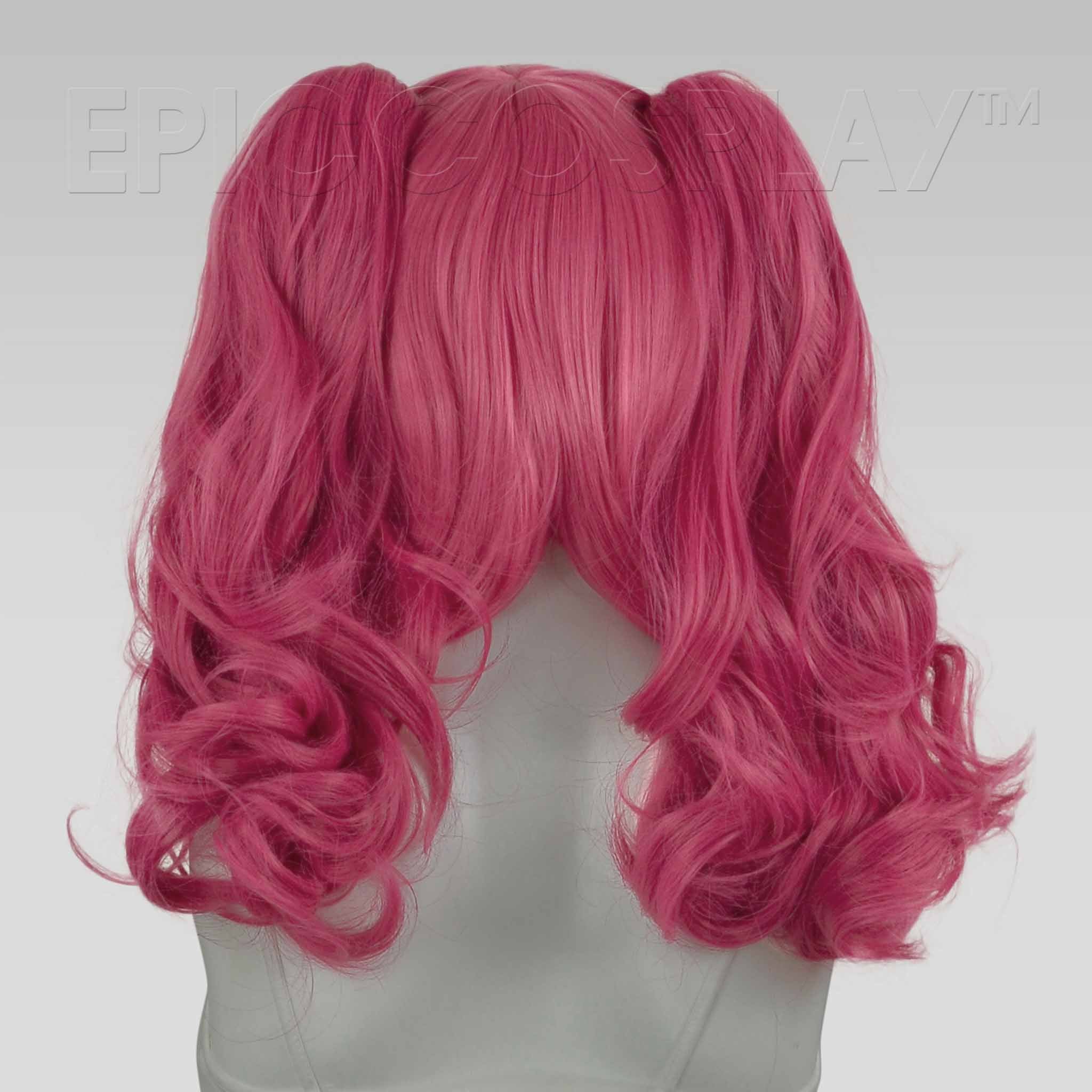 Rhea Sky Magenta Pigtail Wig Set --This Sky Magenta pigtail wig set uses our 14" Chronos style as a base for two of our 20" clip-on ponytails to create a fun and versatile pigtail style. The base wig is a short bob cut style that frames the face and can be worn independently.